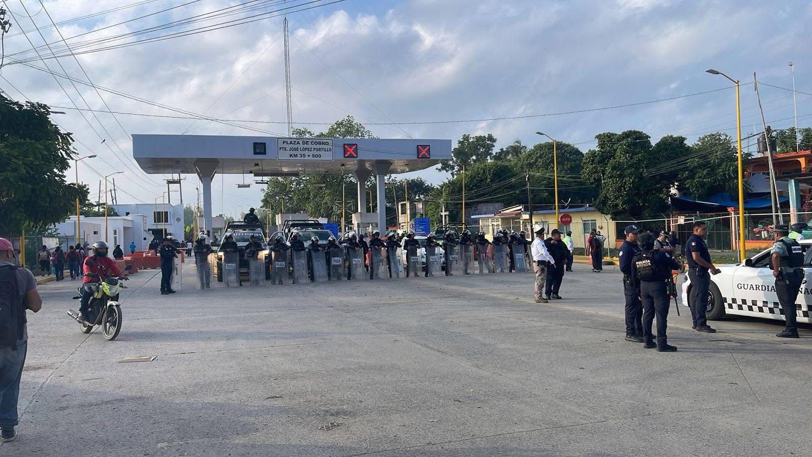 Álamo, Ver.- Elementos de la Policía Antimotines arribaron a la caseta de la Álamo–Cerro Azul, donde grupos de manifestantes mantienen su presencia como parte del paro nacional convocado para este 24 de noviembre.