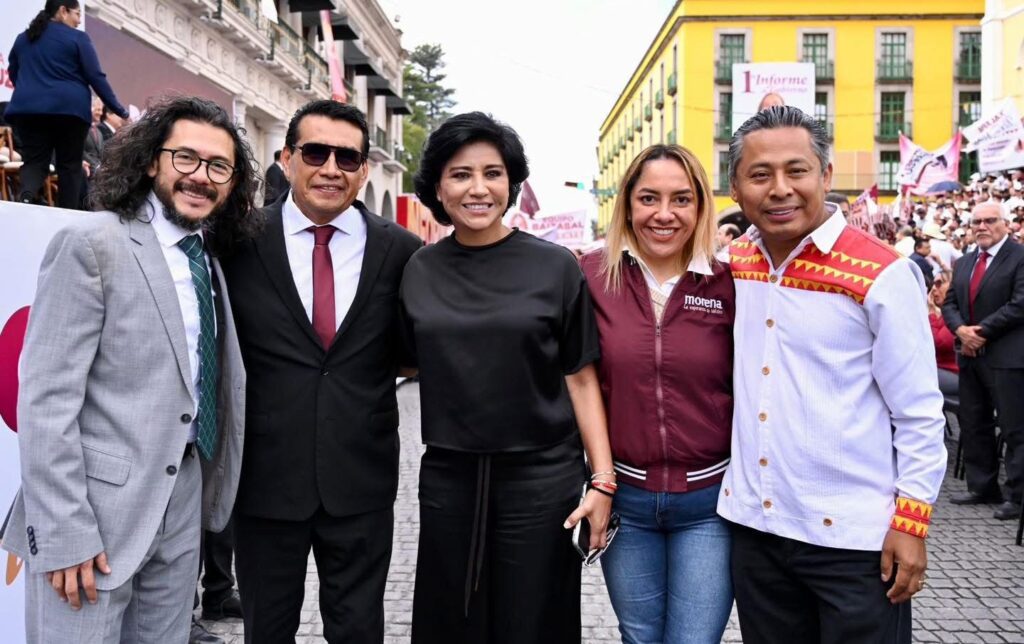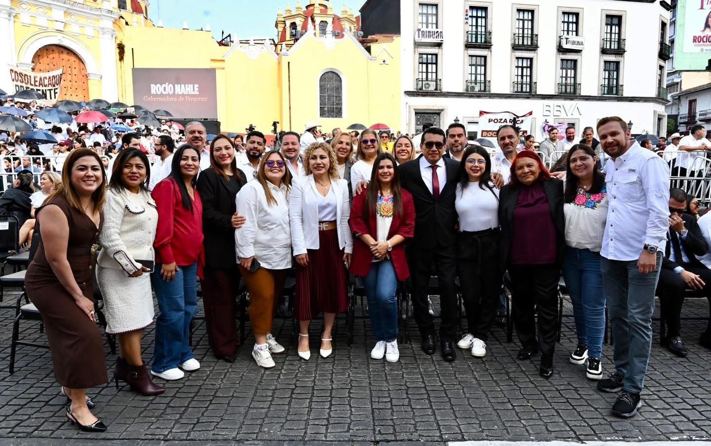 Xalapa, Ver.- Diputadas y diputados de la LXVII Legislatura del estado, encabezados por la presidenta de la Mesa Directiva, Naomi Edith Gómez Santos, y por el presidente de la Junta de Coordinación Política (Jucopo), Esteban Bautista Hernández, acudieron a la ceremonia del Primer Informe de Gobierno de la gobernadora de Veracruz, Rocío Nahle García, realizado en la plaza Lerdo de la ciudad capital.