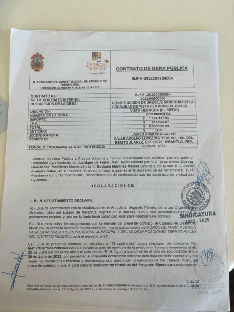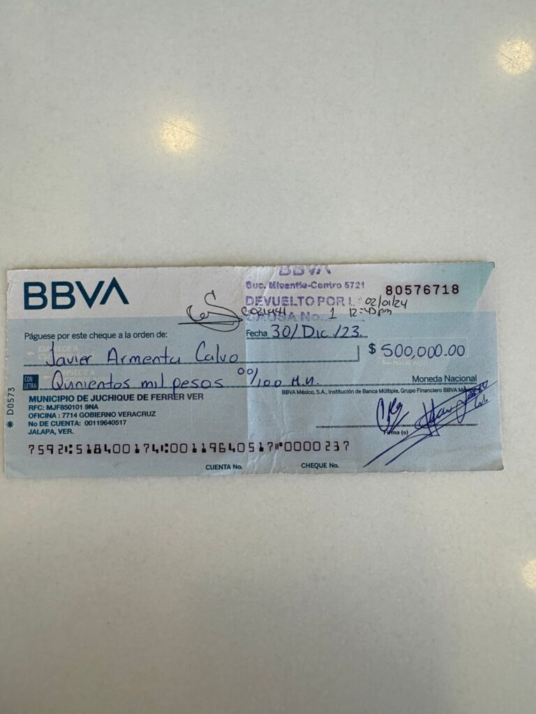 Javier Armenta Calvo, contratista local, ha hecho pública una grave denuncia contra el alcalde de Juchique de Ferrer, Cruz Ulises Cuevas Hernández, a quien acusa de incumplimiento de pago y de cometer un posible fraude al entregar un cheque sin fondos por un anticipo de obra pública. El contrato en cuestión, identificado con el No: 2022300950004, corresponde a la construcción de un drenaje sanitario en la localidad de Vista Hermosa (El Riego), una obra de aproximadamente 2 millones de pesos que, según Armenta, ya fue terminada y está operando en el municipio.