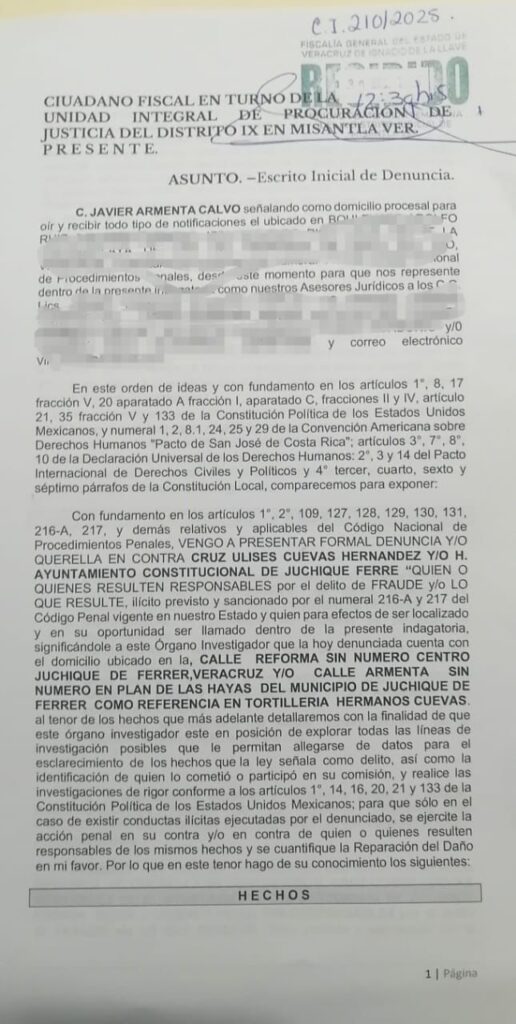 Ante la falta de respuesta y el riesgo inminente de perder lo trabajado, Armenta Calvo hizo una denuncia ante la Fiscalía de la Unidad Integral de Procuración de Justicia del Distrito IX en Misantla, Veracruz; bajo la carpeta de investigación 210/2025.