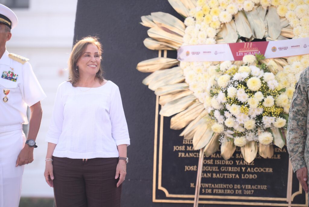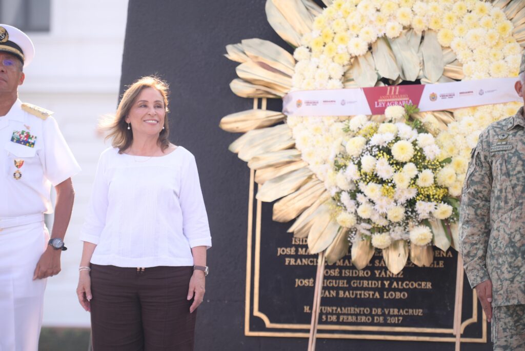 Veracruz, Ver., martes 6 de enero de 2026.– Con una guardia de honor y el depósito de ofrenda floral ante el monumento a Venustiano Carranza, la gobernadora Rocío Nahle García, junto con autoridades de los tres órdenes de gobierno, conmemoró el 111 aniversario de la promulgación de la Ley Agraria.