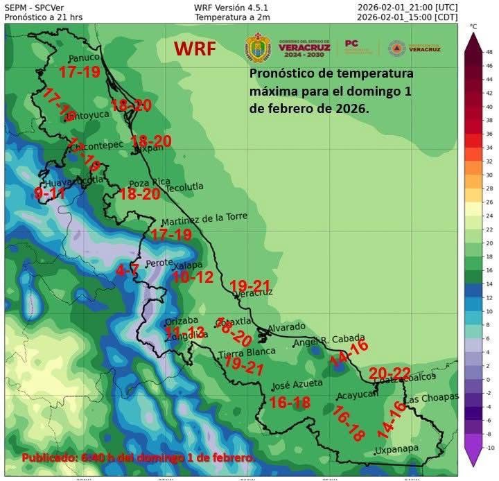 Hoy persiste la probabilidad de lluvia sobre el estado de Veracruz, con los máximos acumulados en costas, llanuras y cuencas del sur. Posible cencellada en partes altas. Viento del Norte y Noreste de 20 a 35 km/h, cambiando al Este y Sureste mañana con igual velocidad. Ambiente templado a muy frío con heladas en partes por la noche-madrugada, y tendencia de aumentar la temperatura máxima mañana.