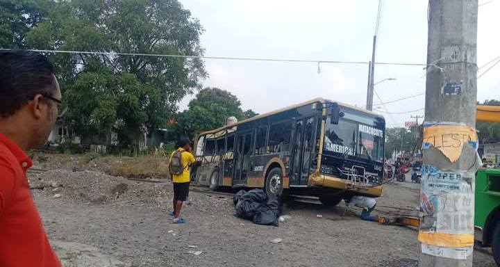 Veracruz.- Un autobús de pasajeros de la línea Ulúa fue arrastrado por el tren en la entrada al fraccionamiento Palma Real al norponiente de la ciudad de Veracruz.