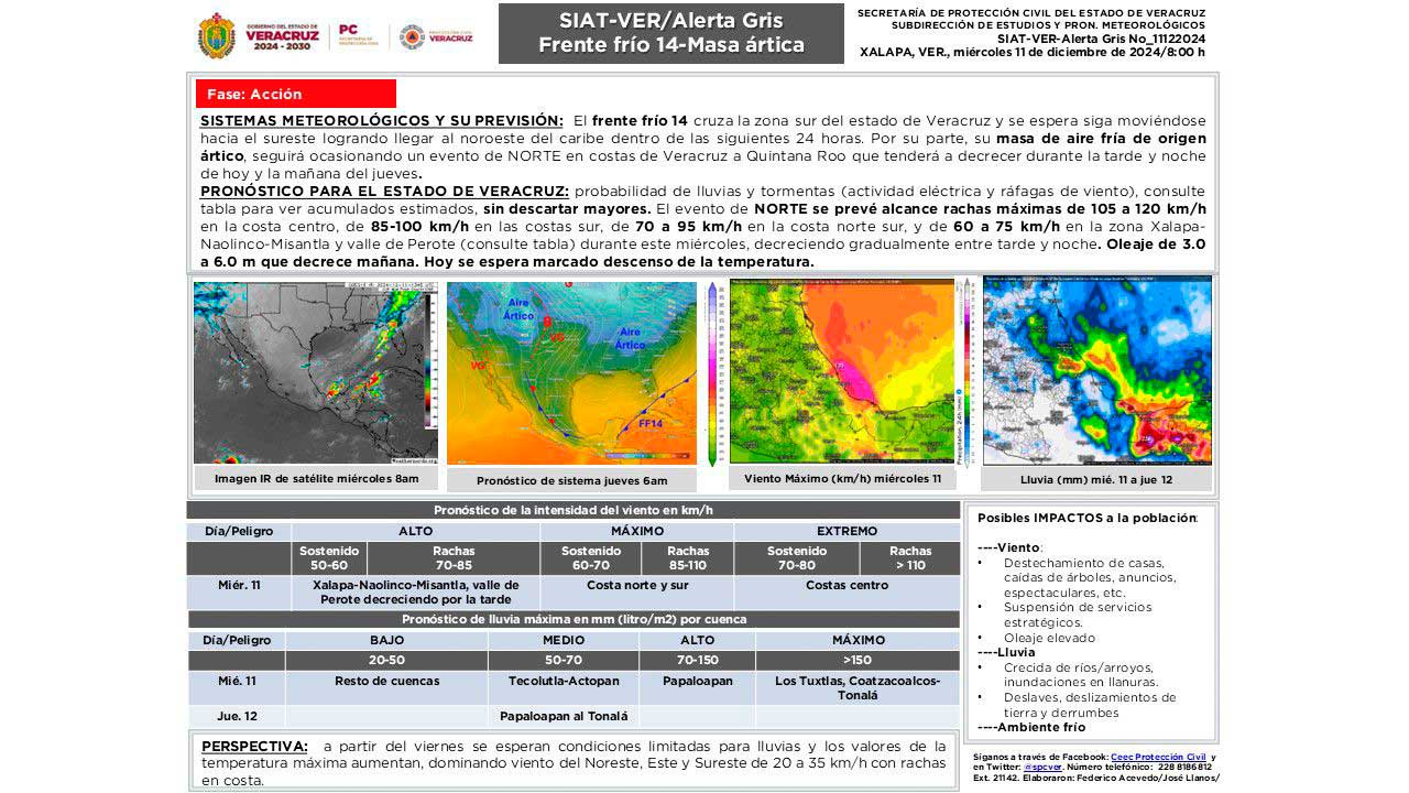 Xalapa, Ver.- El gobierno de Veracruz mantiene activa la Alerta Gris del SIAT-Ver para las siguientes 24 y 48 horas debido al avance del frente frío número 14 y el evento de norte asociado, que generan lluvias y tormentas eléctricas, principalmente en la zona sur del estado.