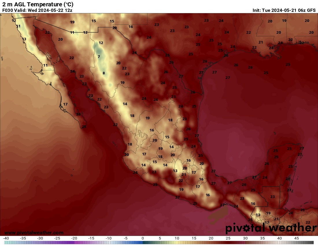 Se prevén temperaturas máximas de 35 a 40 °C en Baja California, Zacatecas, Aguascalientes y Estado de México (suroeste).