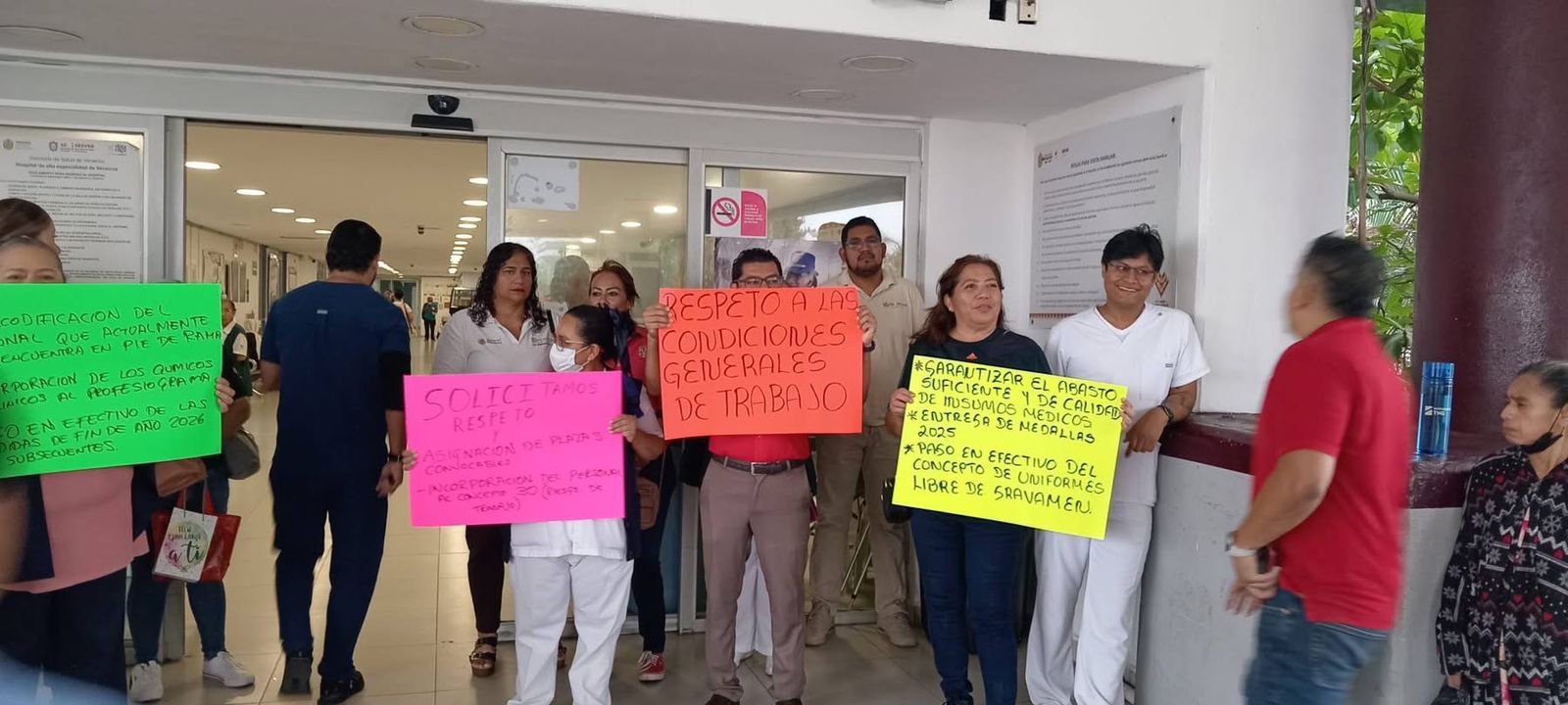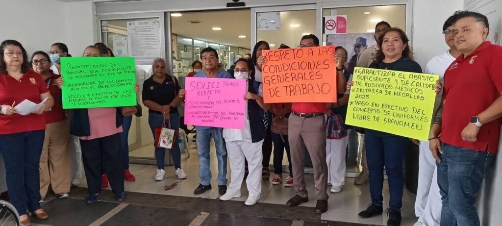 Veracruz, Ver., 20 de abril 2026.- Debido a diversas irregularidades cometidas presuntamente por las autoridades de salud en contra de trabajadores y empleados, este lunes se llevaron a cabo diversas manifestaciones en diferentes clínicas, hospitales y centros de salud del estado, para exigir el cumplimiento de un pliego petitorio de 25 puntos que entregaron, garantizando en todo momento que los servicios que se brindan en los nosocomios, no serían afectados.
