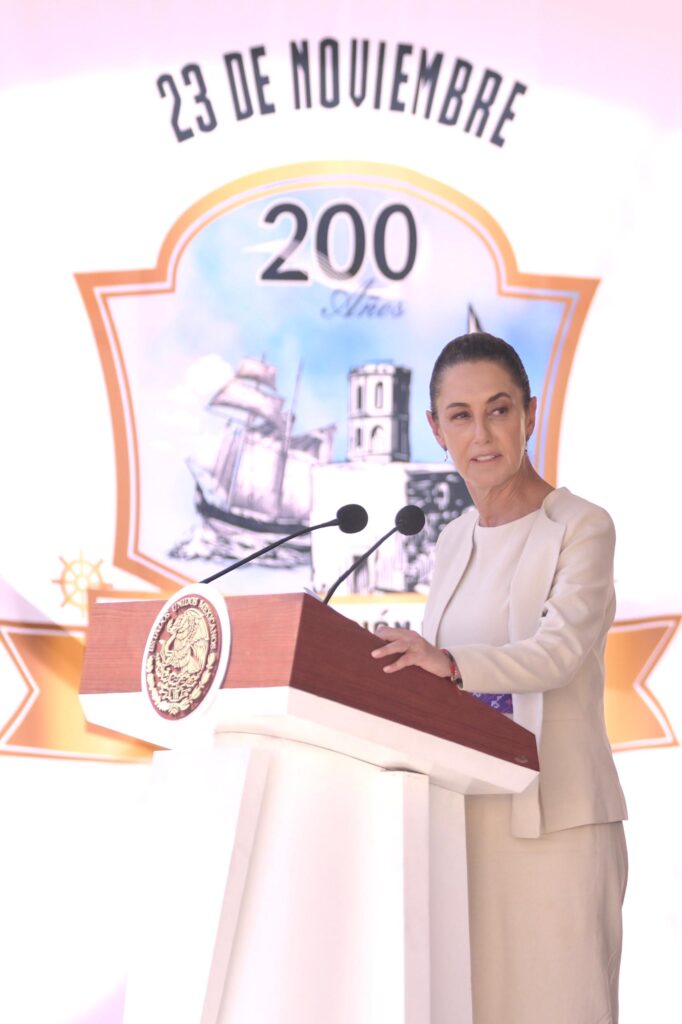 En su mensaje, la jefa del Ejecutivo destacó el carácter emblemático de Veracruz en la historia nacional, subrayando que “ha resistido invasiones, defendido la soberanía y dado gloria a la nación; puerto de puertas abiertas y de corazones valientes”. Afirmó que la Armada de México es heredera de ese legado y convocó a seguir fortaleciendo la independencia nacional “con paz, responsabilidad y amor por México”.