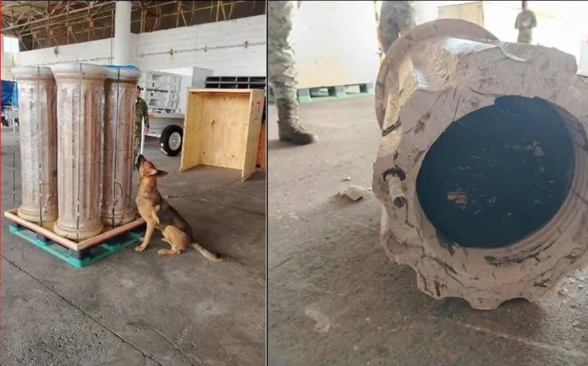 Lo anterior se derivó de una inspección, en la cual elementos de la Marina junto con binomios caninos, efectuaron los protocolos correspondientes, detectando incidencia en mercancía declarada como columna de piedra de cantera; dichas columnas estaban dentro de cuatro pallets.