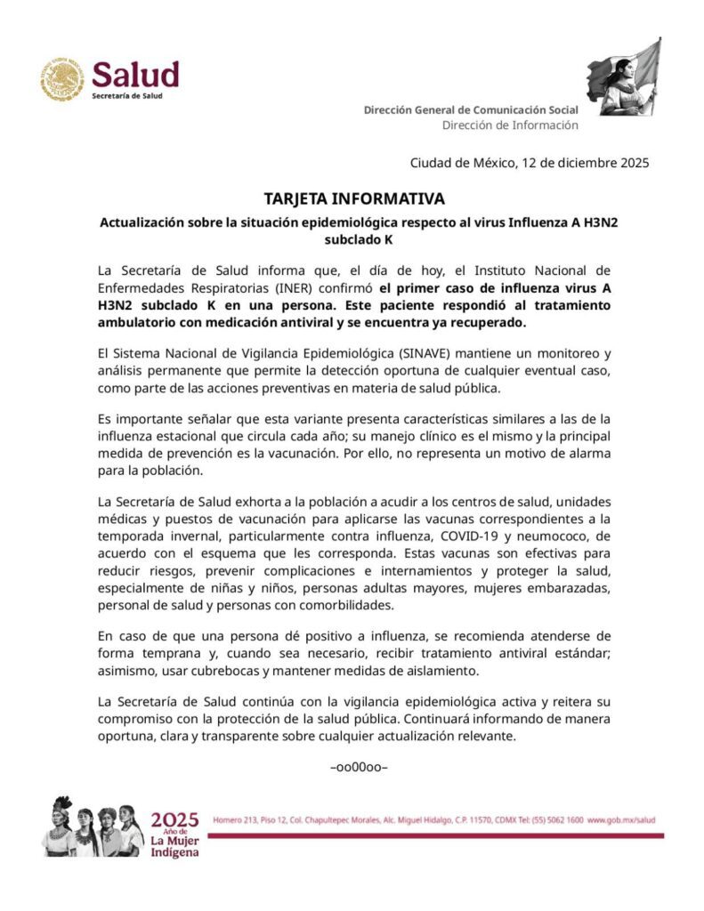 La Secretaría de Salud confirmó la circulación del virus de influenza tipo A H3N2 en México, como parte del comportamiento estacional de la influenza durante la temporada invernal. Las autoridades sanitarias informaron que se mantiene una vigilancia epidemiológica permanente en todo el país para detectar y atender oportunamente los casos, especialmente en grupos de riesgo.