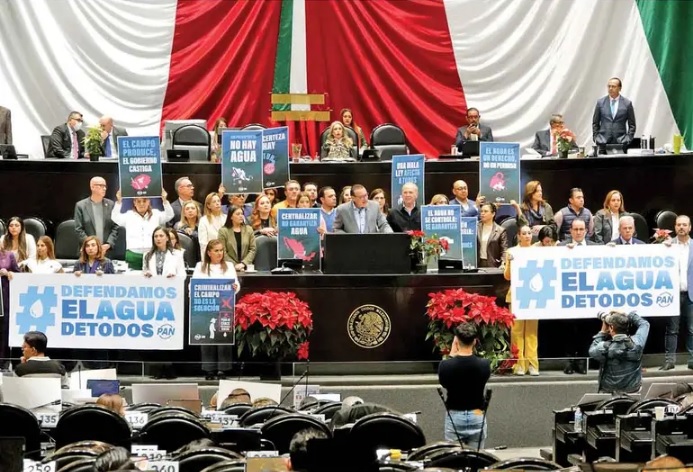 Desde el arranque de la discusión la oposición advirtió que la velocidad con la que avanzó el dictamen no permitía un análisis completo, por lo que, desde la tribuna, los diputados de PAN, PRI y MC desplegaron pancartas con frases como “Morena traiciona a los campesinos”, “El agua es vida, no botín político” y “Morena quiere a los campesinos en la cárcel”, a lo que el partido guinda respondió con su propio muro visual: “El agua es vida, no mercancía” y “Se les acabó el negocio, corruptos del MC y PRIAN”.