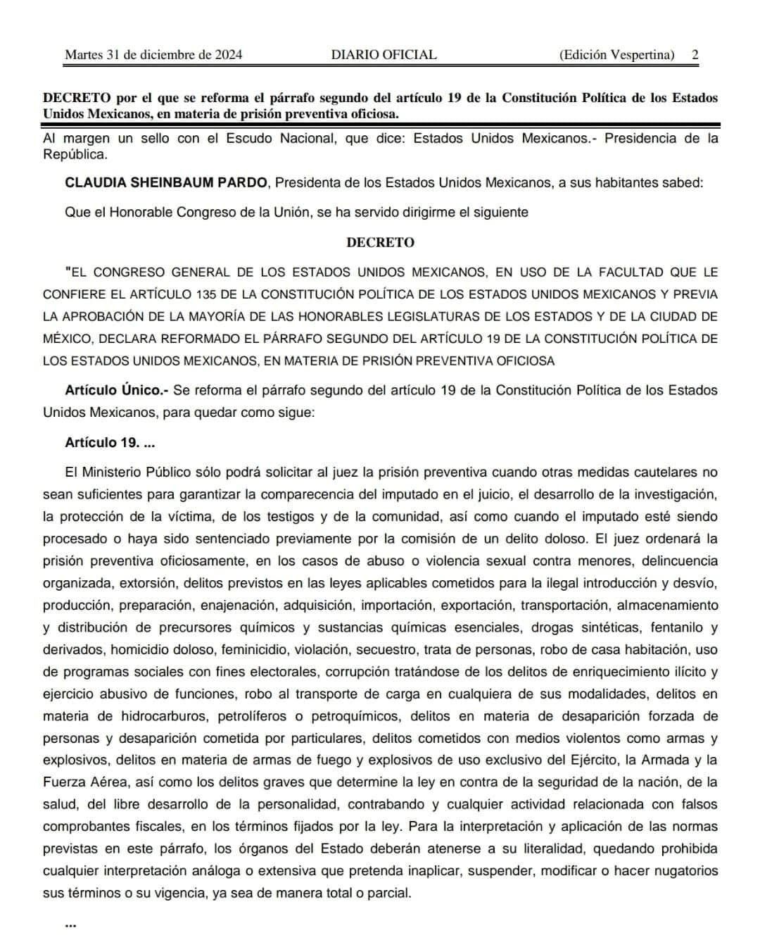 La reforma en materia de prisión preventiva oficiosa fue publicada en el Diario Oficial de la Federación (DOF) la noche del 31 de diciembre de 2024, entrando en vigor a partir de este 01 de enero de 2024.