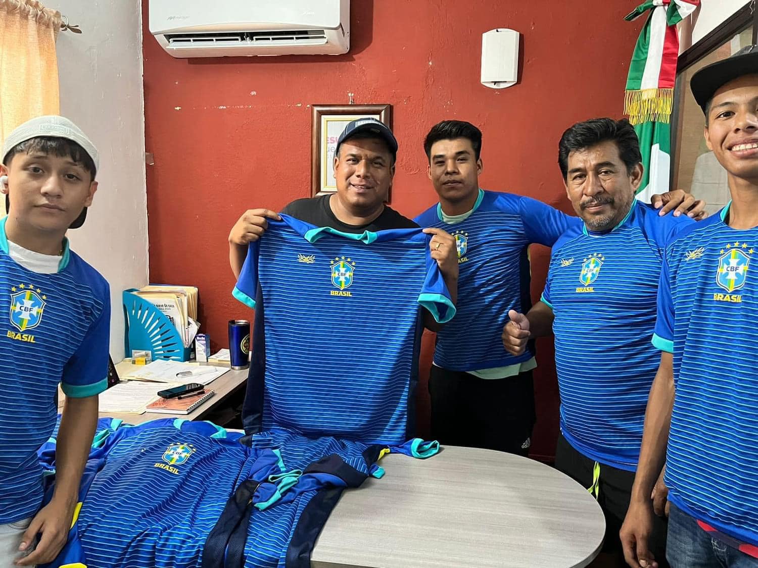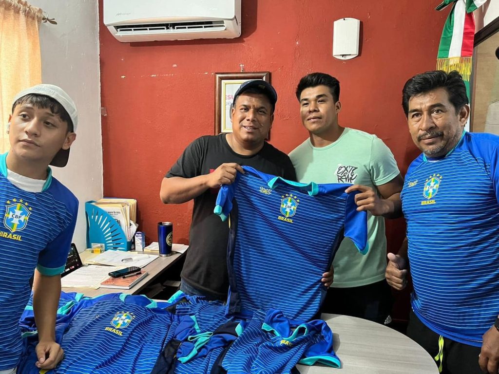 Lerdo de Tejada, Ver.- El presidente del DIF municipal de Lerdo de Tejada, Jorge Luis Medina Alegría entregó uniformes al equipo de fútbol 9 del barrio gasolinera combinado.