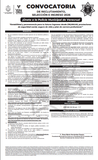 El Ayuntamiento de Veracruz dio a conocer la Convocatoria 2026 para el ingreso a la Policía Municipal de Veracruz, con el propósito de fortalecer las acciones de seguridad y proximidad social en beneficio de la ciudadanía.