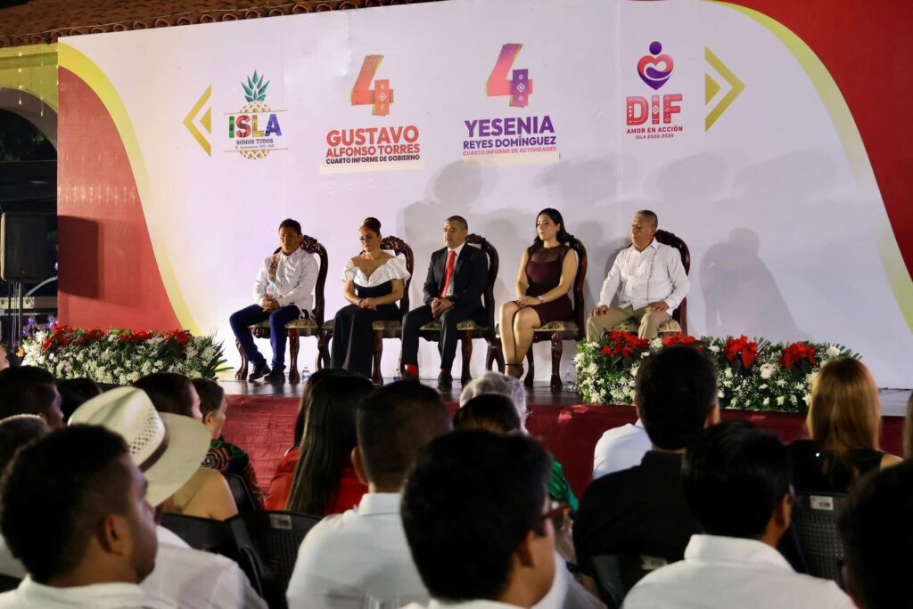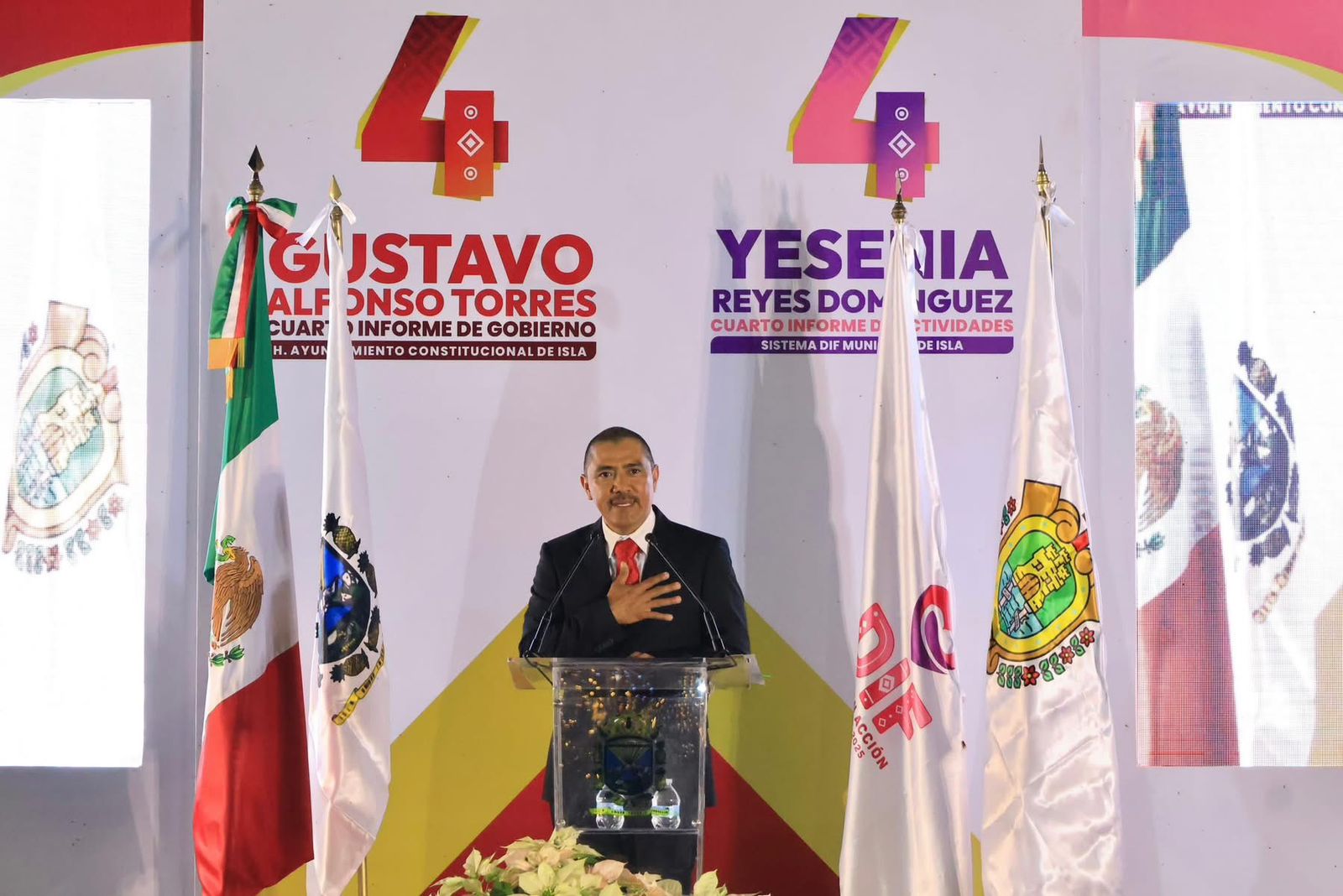 En este cuarto informe de gobierno vimos el trabajo humano de las primeras autoridades de Isla y el beneficio a miles de familias, el alcalde Gustavo Alfonso Torres y la primera dama Yesenia Reyes Domínguez expusieron que dejan un Ayuntamiento y un DIF Municipal con las herramientas necesarias y con finanzas sanas para que se continúe el trabajo de transformación del municipio de Isla.