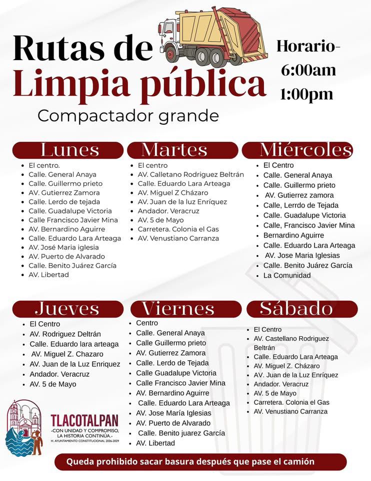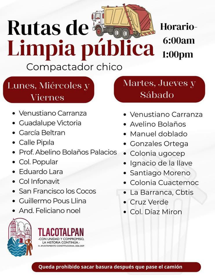 El gobierno municipal solicita amablemente sacar su basura antes del paso del camión, ya que queda estrictamente prohibido sacarla después de que haya pasado.