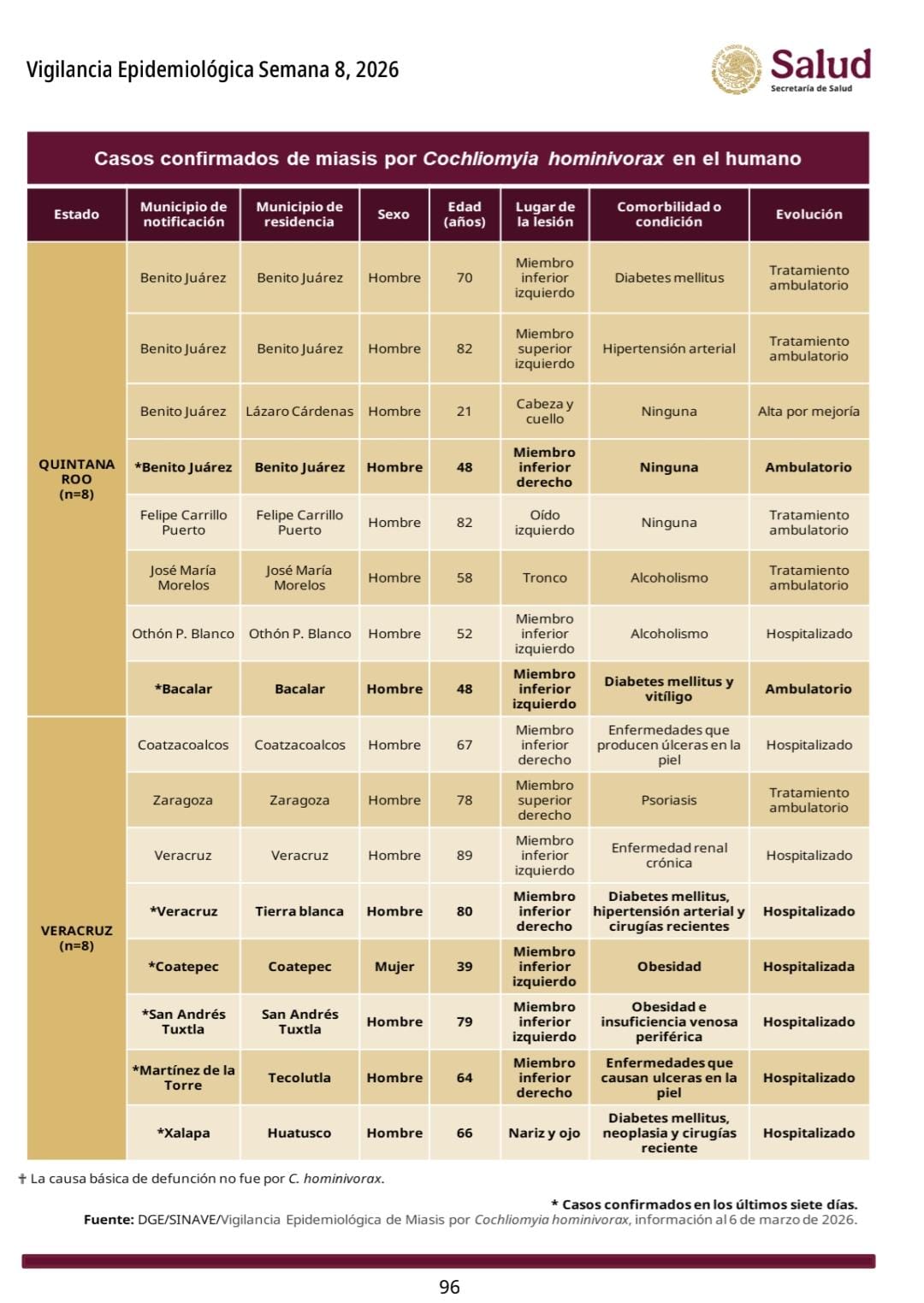 Xalapa, Ver.- La Secretaría de Salud federal, confirmó ocho casos de miasis humana provocada por el gusano barrenador, científicamente conocido como Cochliomyia Hominivorax, según el más reciente boletín del Sistema Nacional de Vigilancia Epidemiológica, correspondiente del 22 al 28 de febrero.